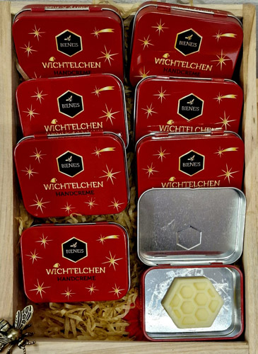 Onze stevige handcrème Wichtelchen : Deze bestaat uit bijenwas, cacaoboter en kokosolie. Deze combinatie zorgt voor soepele en zachte handen. De crème zit boordevol voedende, organische voedingsstoffen en hoeft slechts dun te worden aangebracht. Het smelt op lichaamstemperatuur en trekt snel in zonder een vervelende film op je handen achter te laten. Deze handvleier beschermt uw huid op natuurlijke wijze tegen dagelijkse stress. Verpakt in een mooi vormgegeven blikje is de crème altijd bij de hand, er wordt dus geen plastic gebruikt. De fijne winterse kerstgeur ontstaat door een compositie van essentiële oliën van bloedsinaasappel, rode mandarijn, kaneelblaadjes en kardemom.