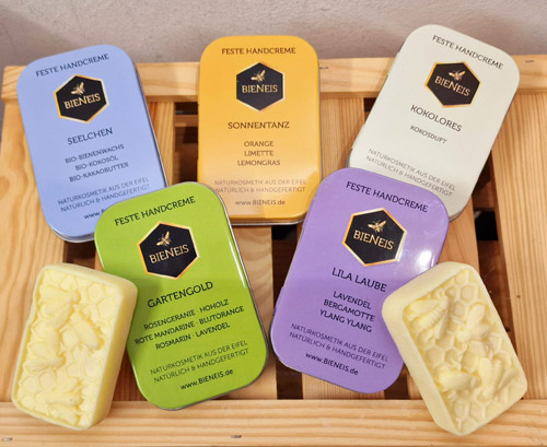 Onze stevige handcrème : Deze bestaat uit pure biologische bijenwas, cacaoboter en kokosolie. Deze combinatie zorgt voor soepele en zachte handen. De crème zit boordevol voedende, organische voedingsstoffen en hoeft slechts dun te worden aangebracht. Het smelt op lichaamstemperatuur en trekt snel in zonder een vervelende film op je handen achter te laten. Deze handvleier beschermt uw huid op natuurlijke wijze tegen dagelijkse stress. Verpakt in een mooi vormgegeven blikje is de crème altijd bij de hand, er wordt dus geen plastic gebruikt. Er zijn zes verschillende geuren verkrijgbaar: Sonnentanz, Lila Laube, Gartengold, Kokolores, Seelchen en VanilleWonne.